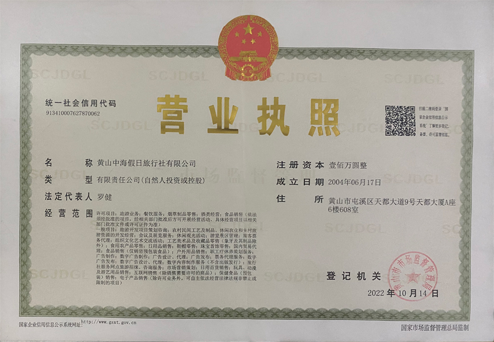 營業(yè)執(zhí)照 旅行社經(jīng)許可證 黃山市旅游投訴電話 0559-12345