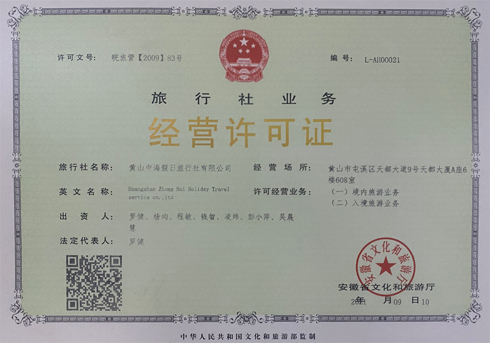 營(yíng)業(yè)執(zhí)照 旅行社經(jīng)許可證 黃山市旅游投訴電話 0559-12345