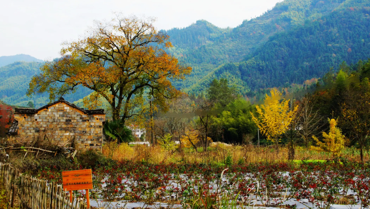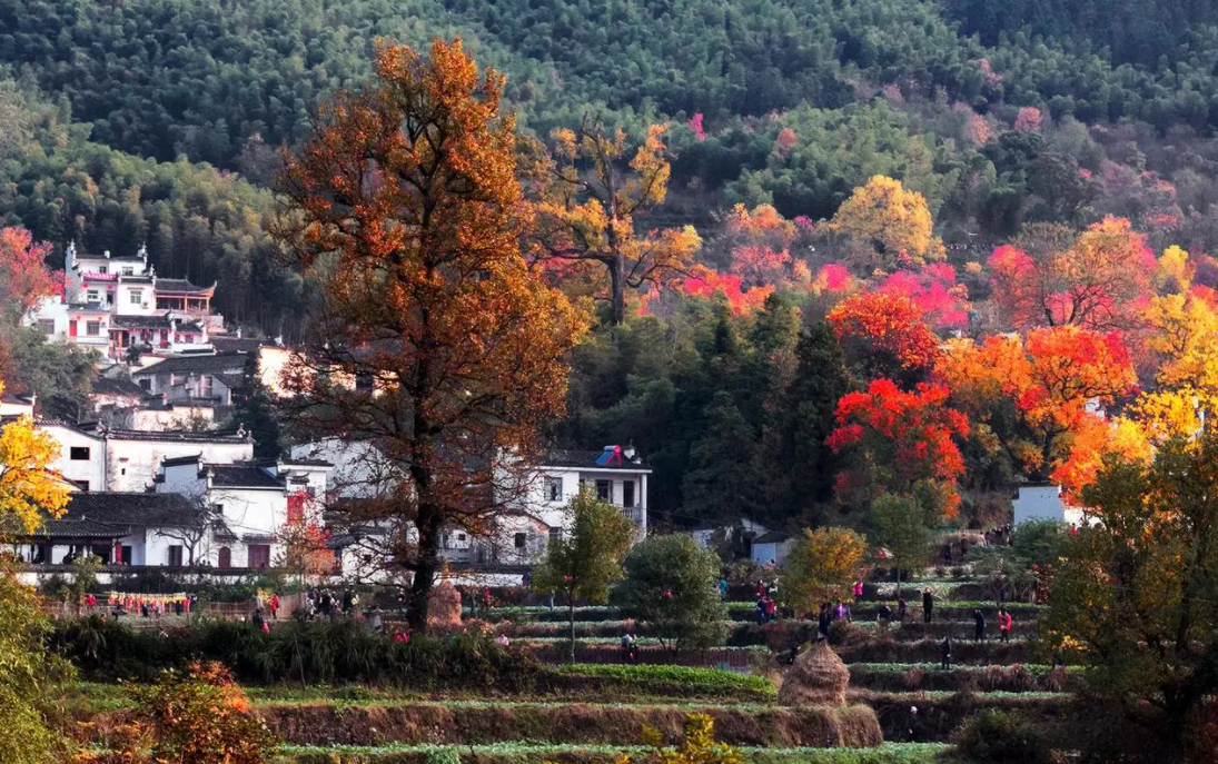 高聳的馬頭墻,火紅的烏桕樹和楓葉,讓人眼花繚亂。村邊的梯田層層疊疊,田地間還有耕耘的黃牛,就像陶淵明筆下的世外桃源,寧靜而安逸。