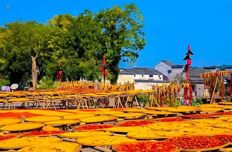 除了婺源,呈坎也保留著相當濃厚的曬秋習俗。村民們把五顏六色的玉米、稻谷、南瓜、紅辣椒擺出來擺成字樣。陽關下的呈坎,別有一番風味。