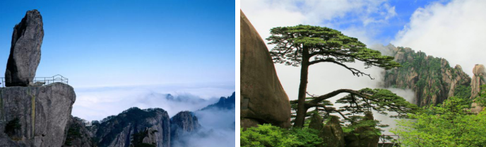 聞名的迎客松、天上玉屏,睡美人,途徑黃山最高峰——蓮花峰,下百步云梯、鰲魚峰天海、 稍事休息,中餐,