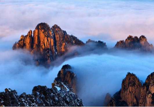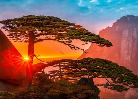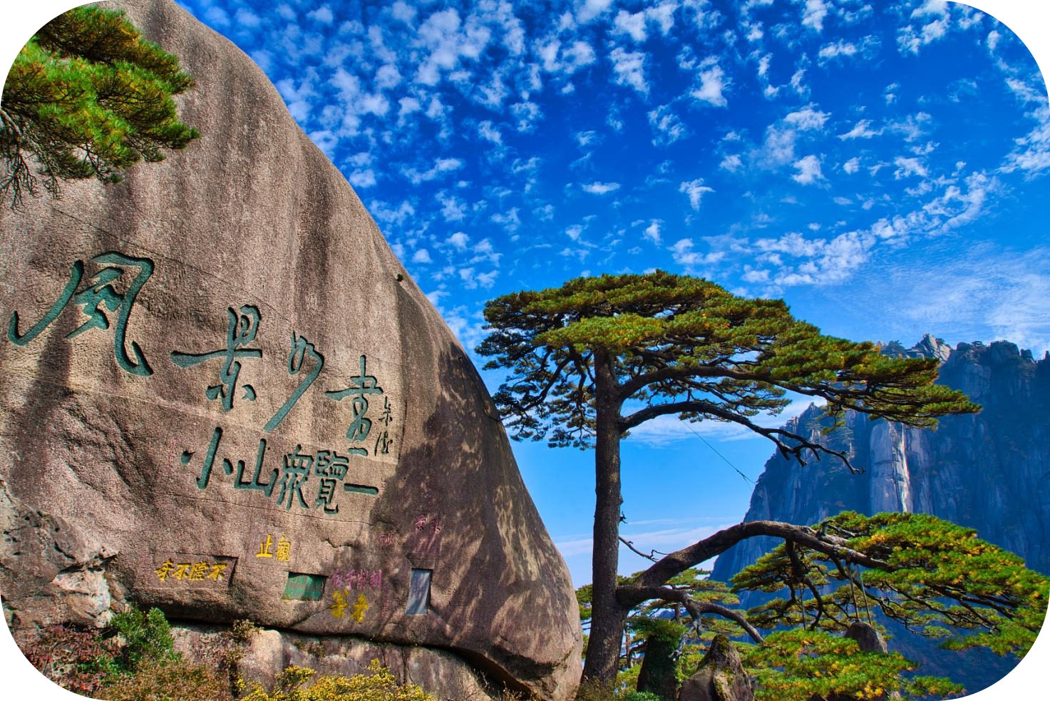 黃山原名“黟山”,因峰巖青黑,遙望蒼黛而名。后因傳說(shuō)軒轅黃帝曾在此煉丹,故改名為“黃山”。黃山代表景觀有“五絕三瀑”,四絕:奇松、怪石、云海、溫泉、冬雪;三瀑:人字瀑、百丈泉、九龍瀑。黃山迎客松是安徽人民熱情友好的象征,承載著擁抱世界的東方禮儀文化。明朝旅行家徐霞客登臨黃山時(shí)贊嘆:“薄海內(nèi)外之名山,無(wú)如徽之黃山。登黃山,天下無(wú)山,觀止矣!”被后人引申為“五岳歸來(lái)不看山,黃山歸來(lái)不看岳”。