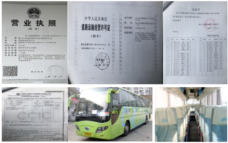 黃山市安馳旅游汽車有限責(zé)任公司:注冊(cè)資本705萬(wàn)元整,具有安徽省交通廳頒發(fā)的客運(yùn)道路運(yùn)輸經(jīng)營(yíng)許可證,具備?。ㄊ校╇H旅游、客運(yùn)包車服務(wù)的專業(yè)運(yùn)輸企業(yè),所屬車輛均已投保交通強(qiáng)制責(zé)任險(xiǎn),承運(yùn)人責(zé)任險(xiǎn)每座位60萬(wàn),第三者責(zé)任險(xiǎn)100萬(wàn),派遣的每臺(tái)車輛均有備案。